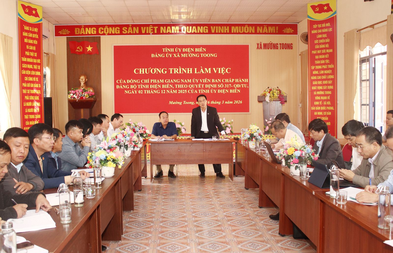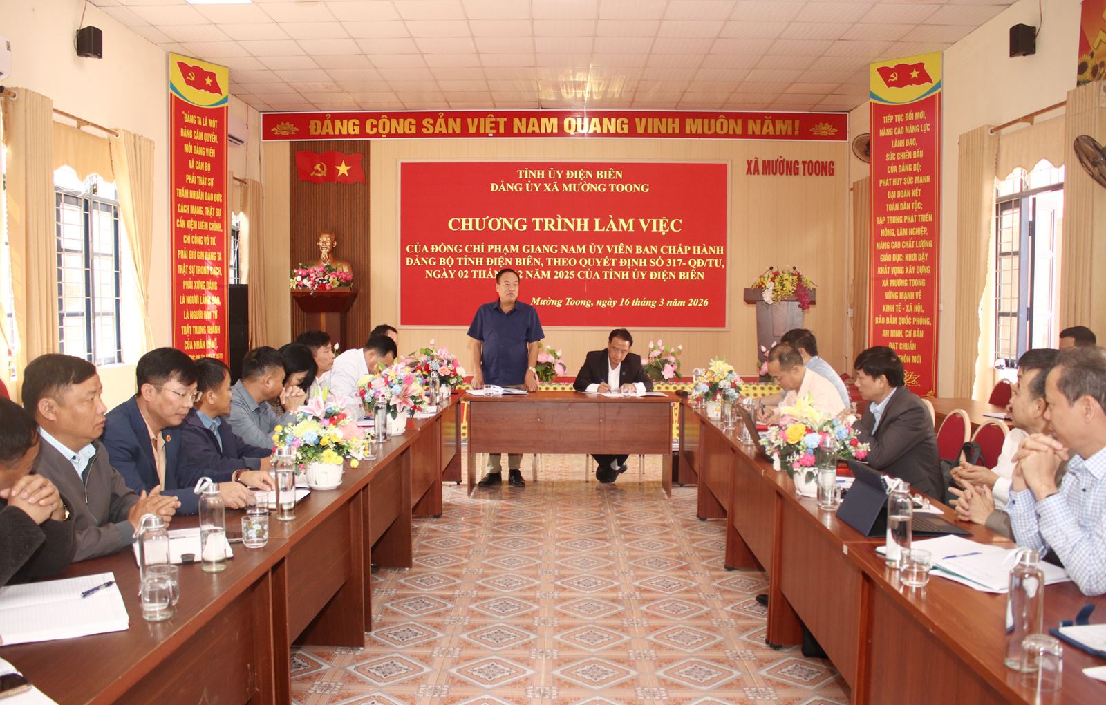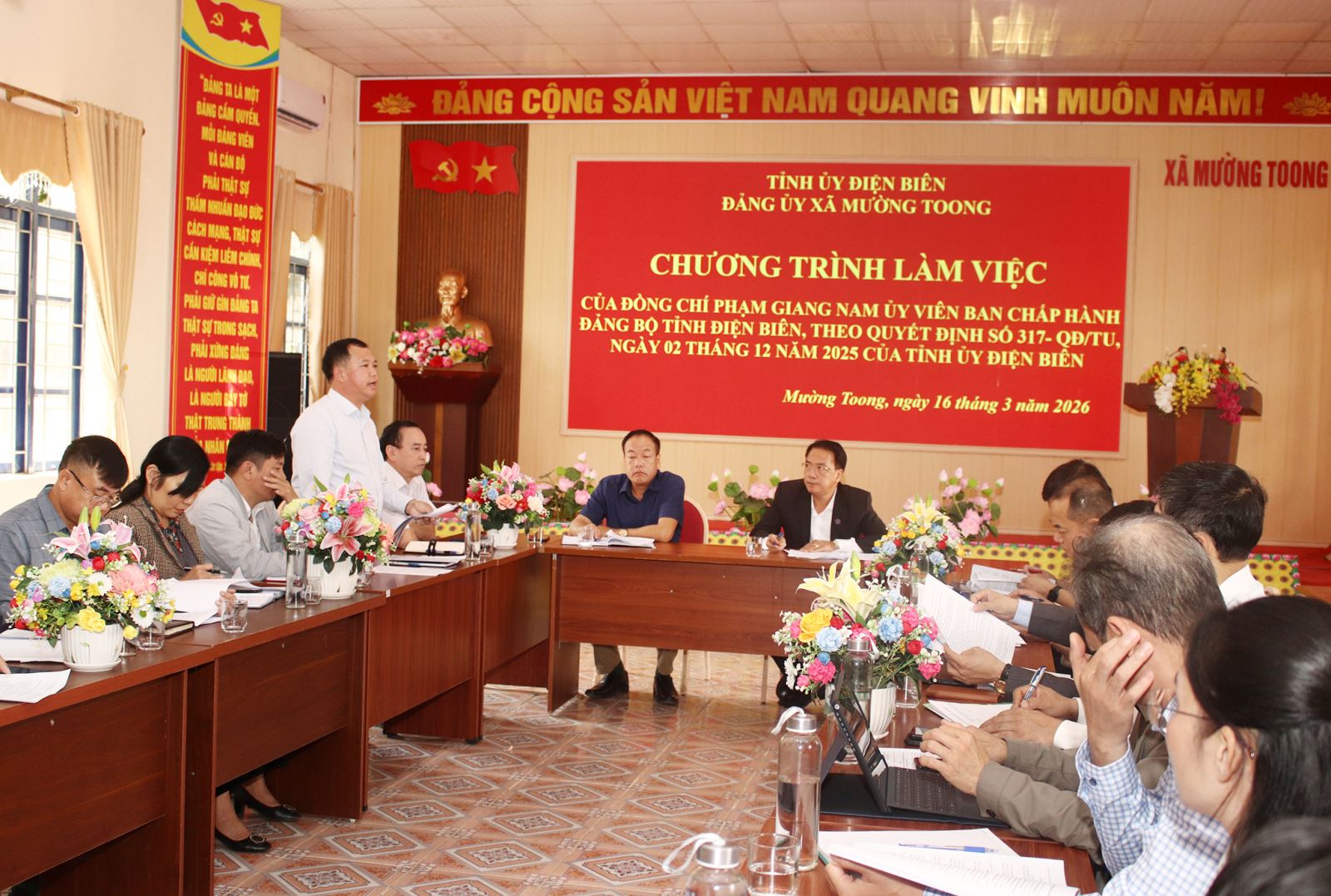 Tại buổi làm việc, lãnh đạo xã Mường Toong đã báo cáo khái quát về tình hình thực hiện nhiệm vụ phát triển kinh tế xã hội – Quốc phòng an ninh. Trong thực hiện công tác y tế, ngay từ đầu năm UBND xã đã xây dựng và ban hành các văn bản chỉ đạo thực hiện công tác phòng chống dịch bệnh, sẵn sàng các điều kiện y tế ứng phó với thiên tai, thảm họa và duy trì hiệu quả việc thực hiện các Chương trình mục tiêu y tế dân số và công tác khám chữa bệnh cho người dân tại 01 Trạm Y tế và 01 Điểm trạm (Huổi Lếch). Tỷ lệ trẻ em dưới 01 tuổi được tiêm chủng đầy đủ các loại vắc xin đạt 99,6%; trẻ em trong độ tuổi được tiêm Sởi – Rubella mũi 2 đạt 94,2%; đẩy mạnh các hoạt động truyền thông nâng cao nhận thức của người dân về nâng cao chất lượng dân số, bảo vệ quyền và phòng chống bạo lực trẻ em… Công tác khám chữa bệnh và phục hồi chức năng thực hiện khám chữa bệnh cho trên 2.758 lượt người; khám chữa bệnh bằng y học cổ truyền kết hợp y học hiện đại cho trên 1.438 lượt người. Tỷ lệ bao phủ BHYT đạt trên 98%.