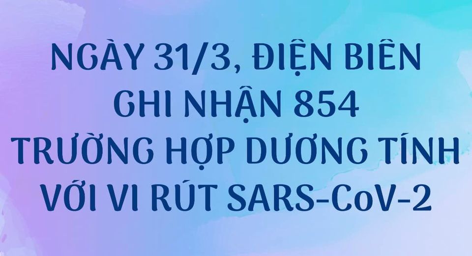 01/04/2022Tính từ 18h00 ngày 30/3/2022 đến 18h00 ngày 31/3/2022 Điện Biên ghi nhận thêm 854 trường hợp dương tính với vi rút SARS-CoV-2.