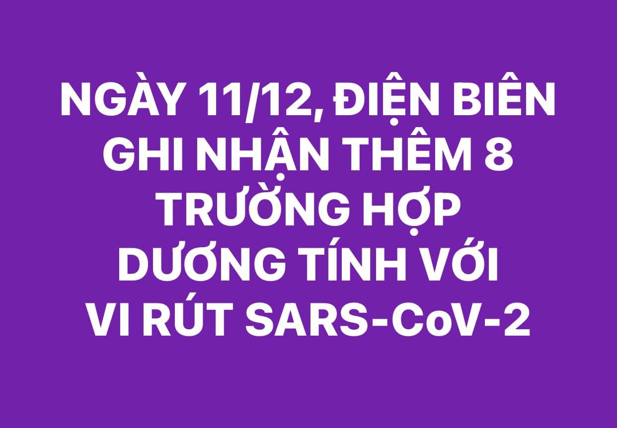 11/12/2021Tính đến 20h00 ngày 11/12, trên địa bàn tỉnh Điện Biên ghi nhận thêm 08 trường hợp có kết quả xét nghiệm dương tính với vi rút SARS-CoV-2 tại huyện Mường Nhé, Mường Chà, Mường Ảng và thành phố Điện Biên Phủ.