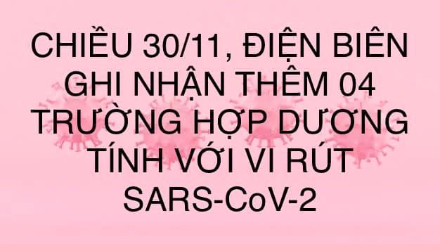 29/11/2021Tính đến 15h00 ngày 30/11, trên địa bàn tỉnh Điện Biên ghi nhận thêm 04 trường hợp có kết quả xét nghiệm dương tính với vi rút SARS-CoV-2 tại huyện Mường Nhé và huyện Điện Biên.