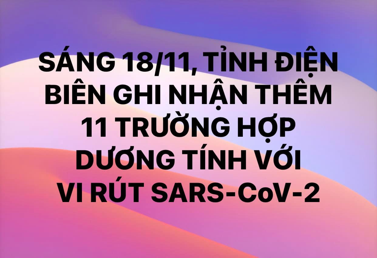 18/11/2021Tính từ 21h00 ngày 17/11/2021 đến 04h00 ngày 18/11/2021 , trên địa bàn tỉnh Điện Biên ghi nhận thêm 11 trường hợp có kết quả xét nghiệm dương tính với vi rút SARS-CoV-2 tại thành phố Điện Biên Phủ (08) và huyện Điện Biên (03).
