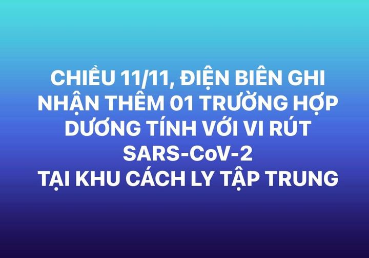 11/11/2021Tính từ 08h00 đến 15h00 ngày 11/11, trên địa bàn tỉnh Điện Biên ghi nhận thêm 01 trường hợp có kết quả xét nghiệm dương tính với vi rút SARS-CoV-2 tại khu cách ly tập trung.